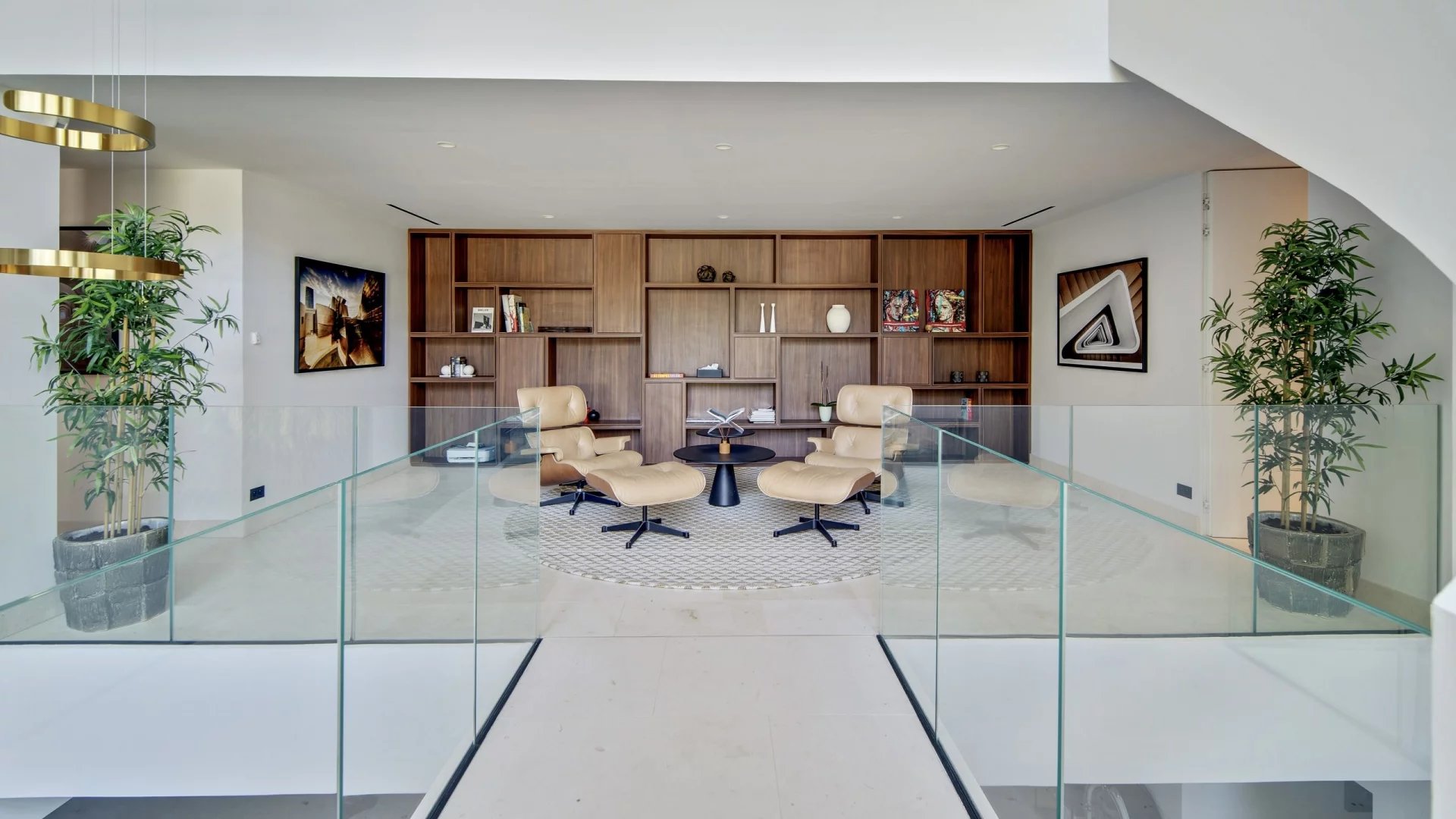 Le salon spacieux, baigné de lumière naturelle grâce à de larges baies vitrées panoramiques, dispose d’un coin TVconfortable et d’une bibliothèque, créant une atmosphère à la fois chaleureuse et raffinée.