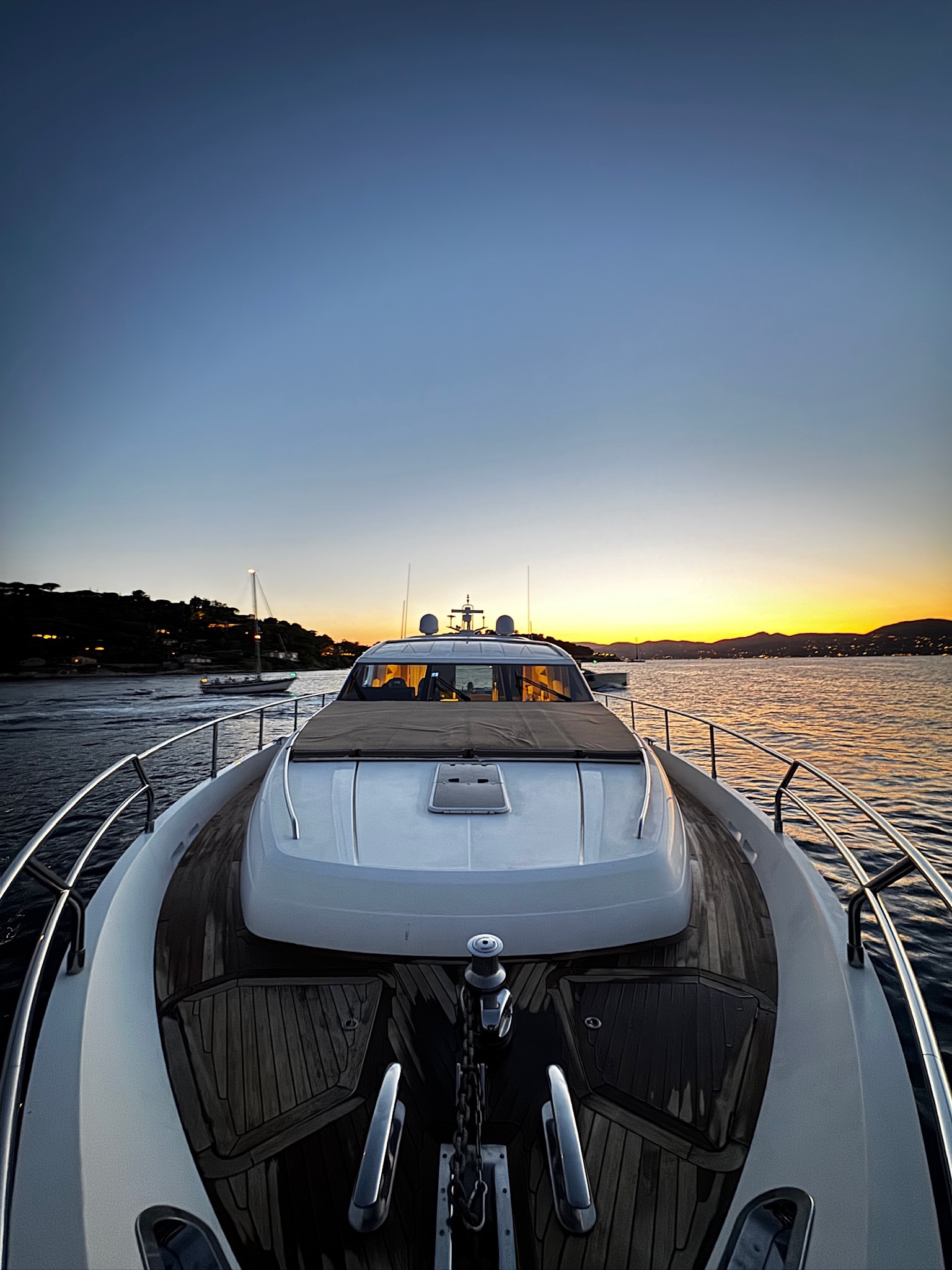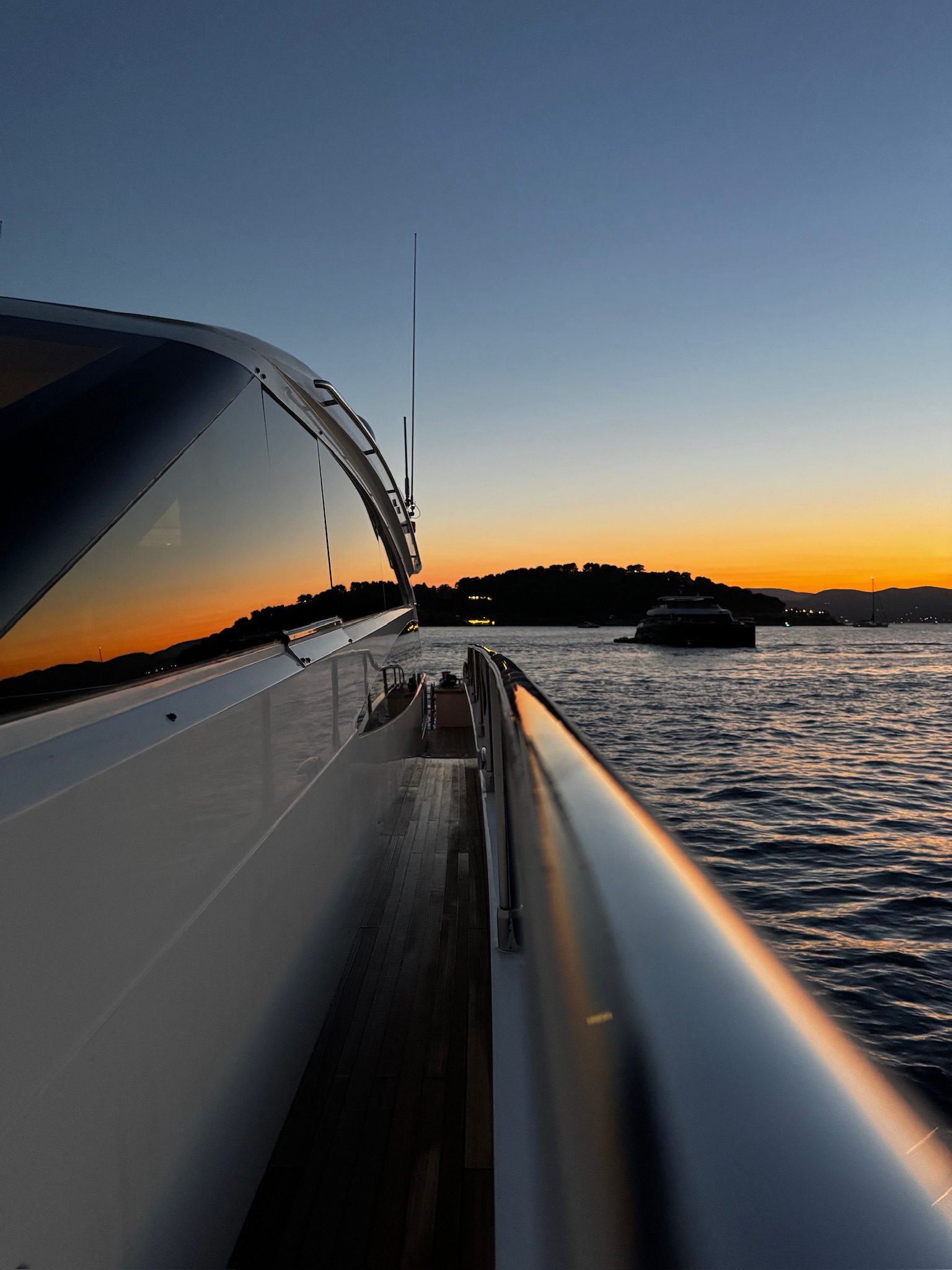 Launched in 2011, the luxury motor yacht FREEDOM embodies French elegance on the waters of the Mediterranean. With a length of 23.8 meters and a sleek black-and-white silhouette, she commands immediate attention. On board, she accommodates up to 8 guests in 4 cabins: a full-beam Master Suite, a double VIP cabin, a convertible twin cabin, and a berth cabin all air-conditioned and equipped with private bathrooms. The 2-person crew (captain and chef/hostess) attends to every detail. Performance: powered by two Caterpillar C32 V12 engines delivering up to 1,900 hp each, she reaches a top speed of 36 knots and cruises at 25 knots. Available: Seabob F5, paddleboard, water skis, wakeboard, towable tube, snorkeling masks, and jet ski upon request. The Williams 385 tender (150 hp) rounds out the equipment. Living spaces: panoramic salon, spacious cockpit, hydraulic swim platform, outdoor Bluetooth speakers, Wi-Fi, ice maker, and indoor/outdoor dining areas.