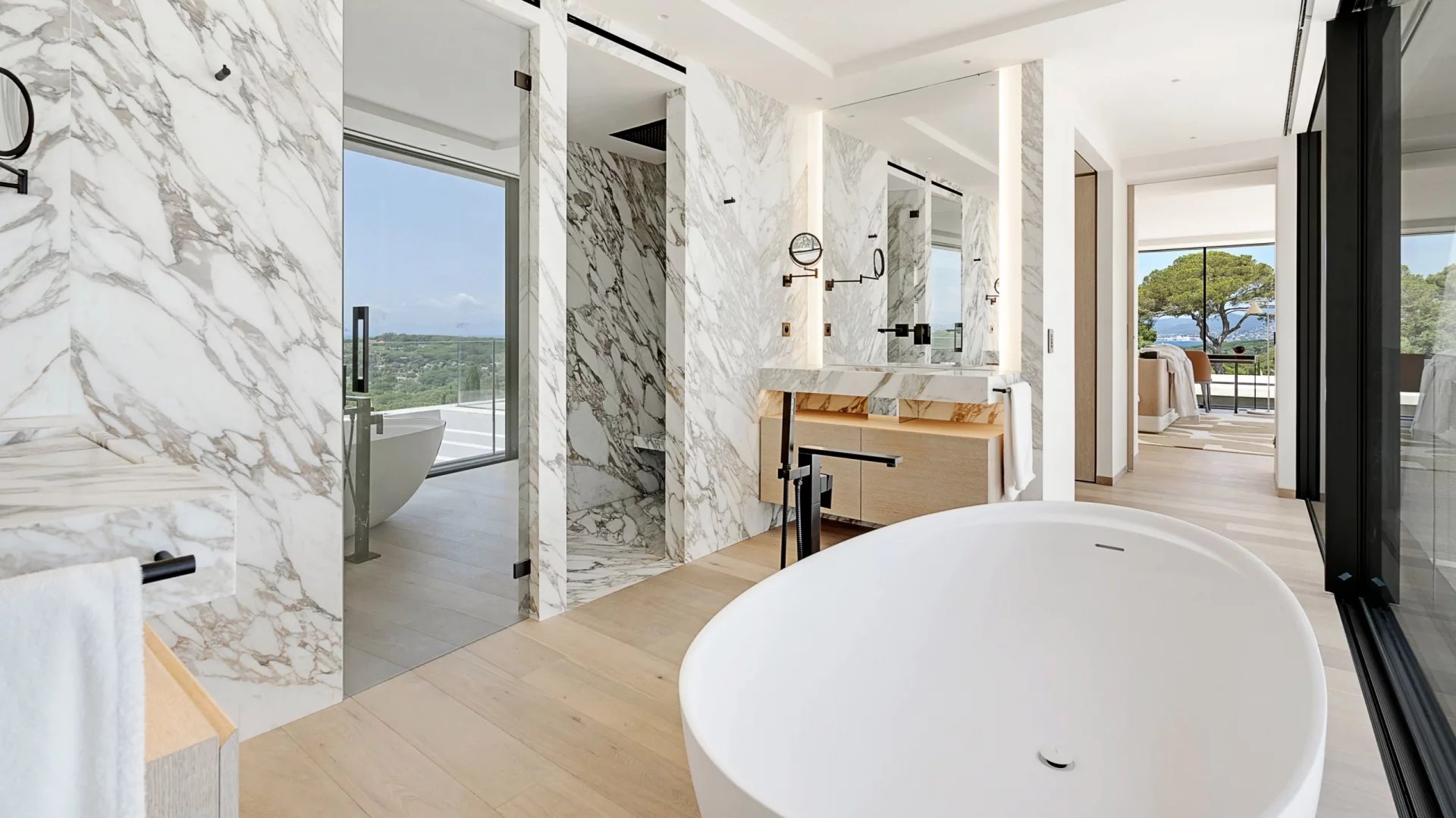 Cette propriété contemporaine d’exception se déploie sur un terrain paysager de 2 700 m² et comprend deux villas neuves indépendantes, chacune dotée de sa piscine et bénéficiant d’une vue mer panoramique spectaculaire.
