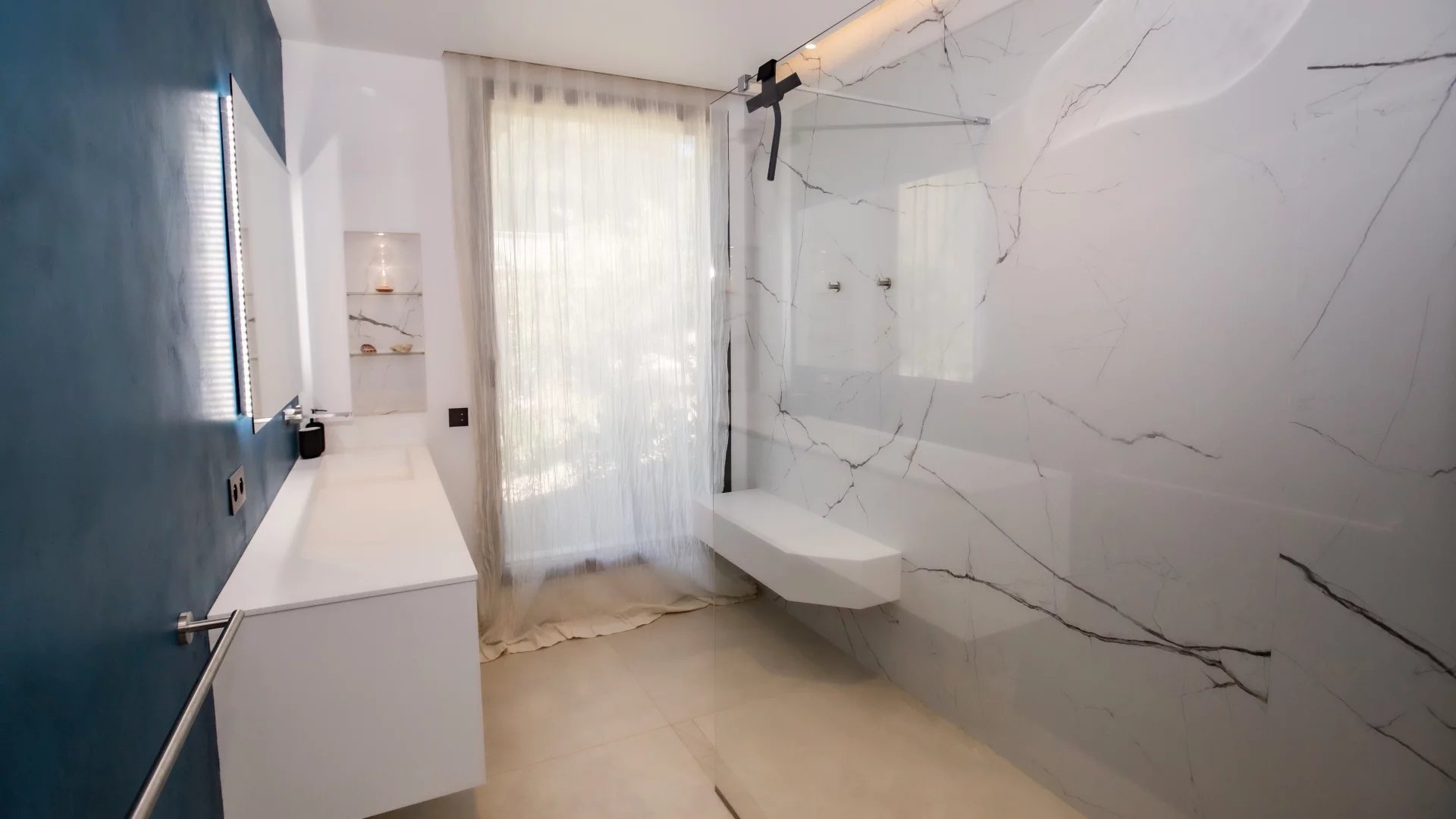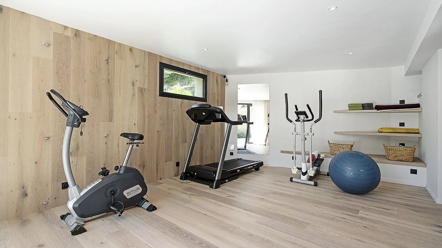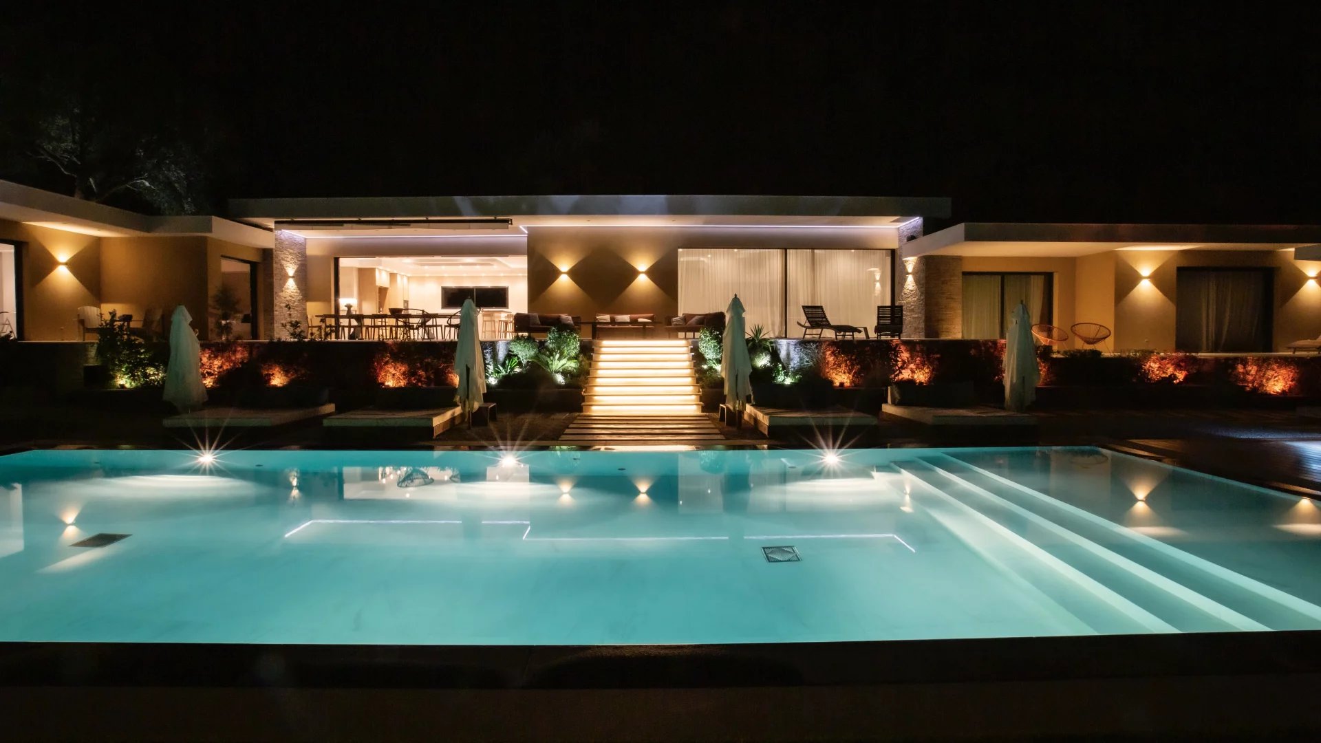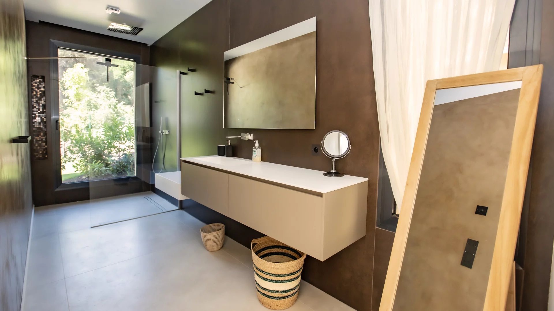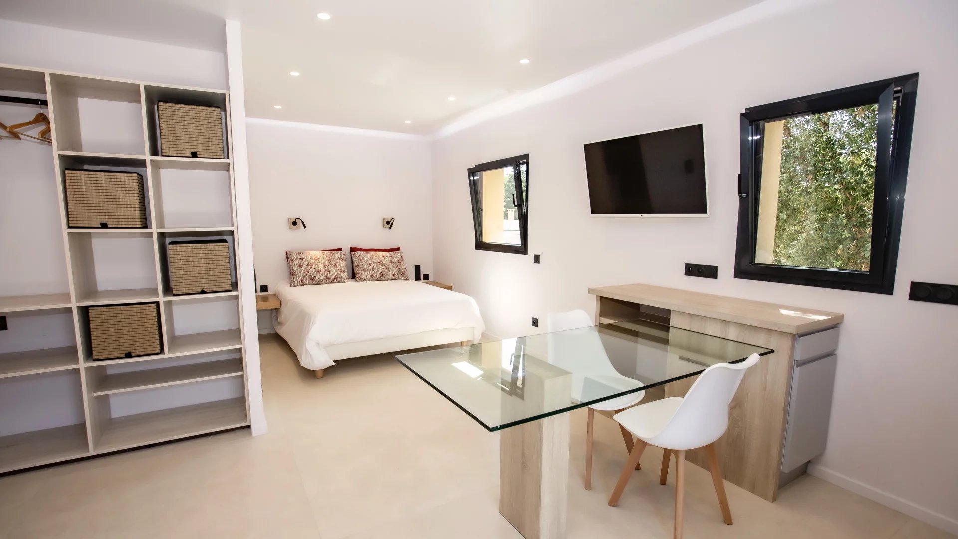 La villa développe environ 450 m² habitables et se compose d’une maison principale, d’une dépendance dédiée au bien-être et d’un studio indépendant, garantissant intimité et flexibilité d’organisation.