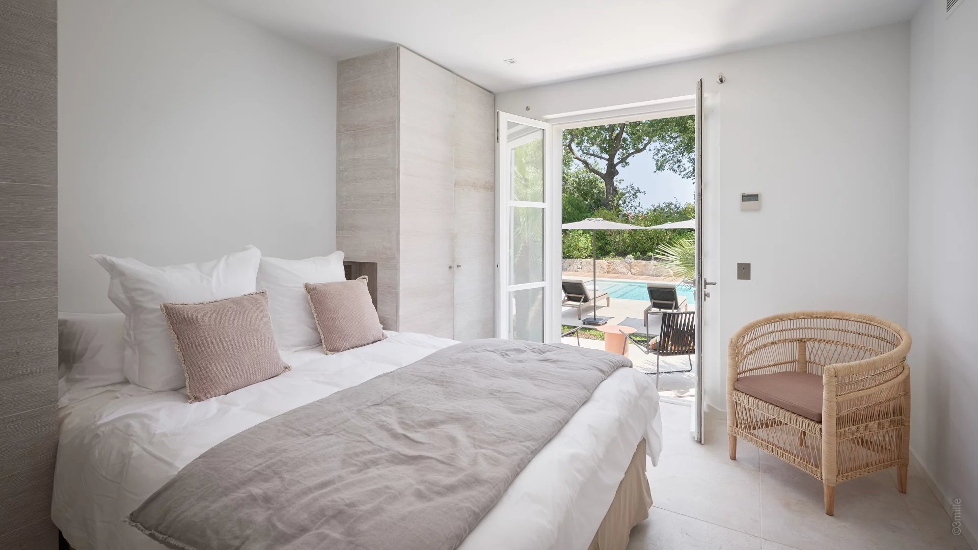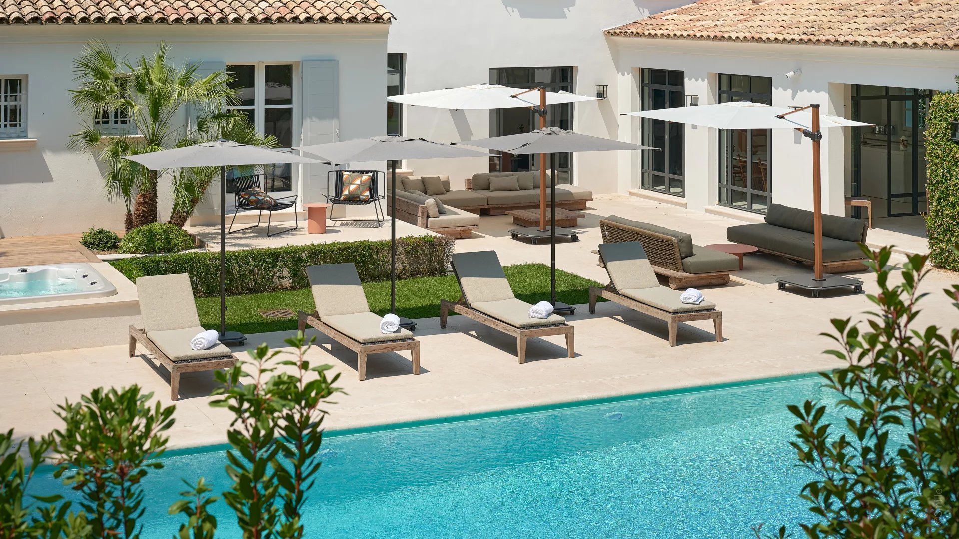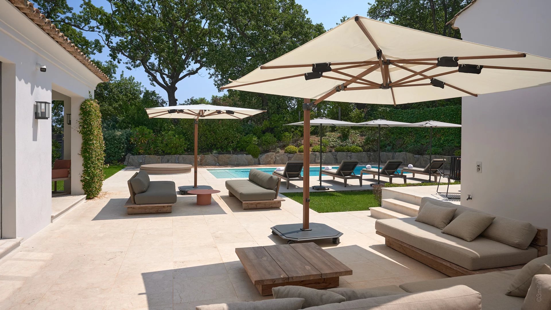 Nichée au cœur d’un écrin de verdure, cette villa offre un cadre exclusif avec jardin paysager, piscine chauffée et jacuzzi, invitant à la détente et à un art de vivre résolument tropézien.