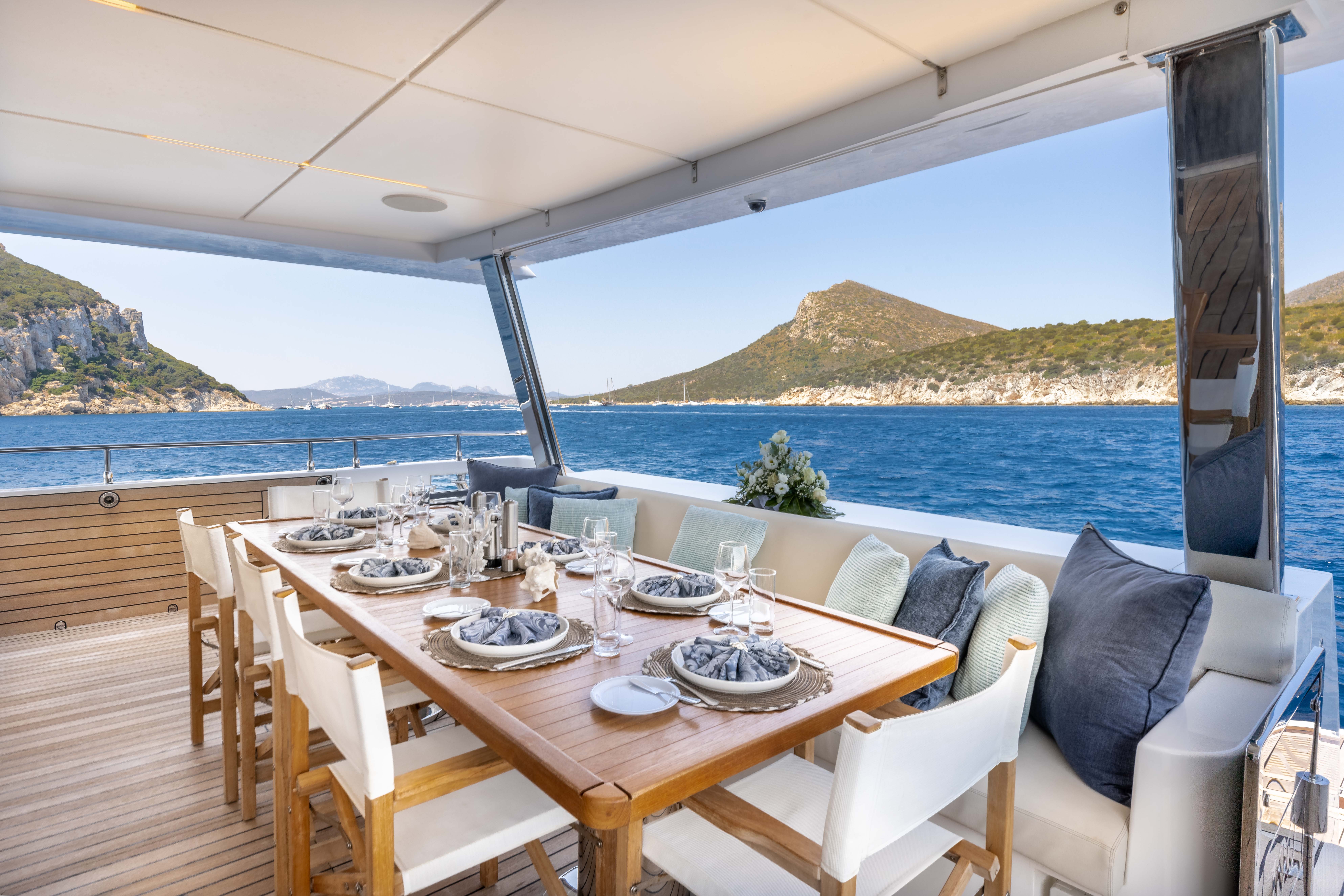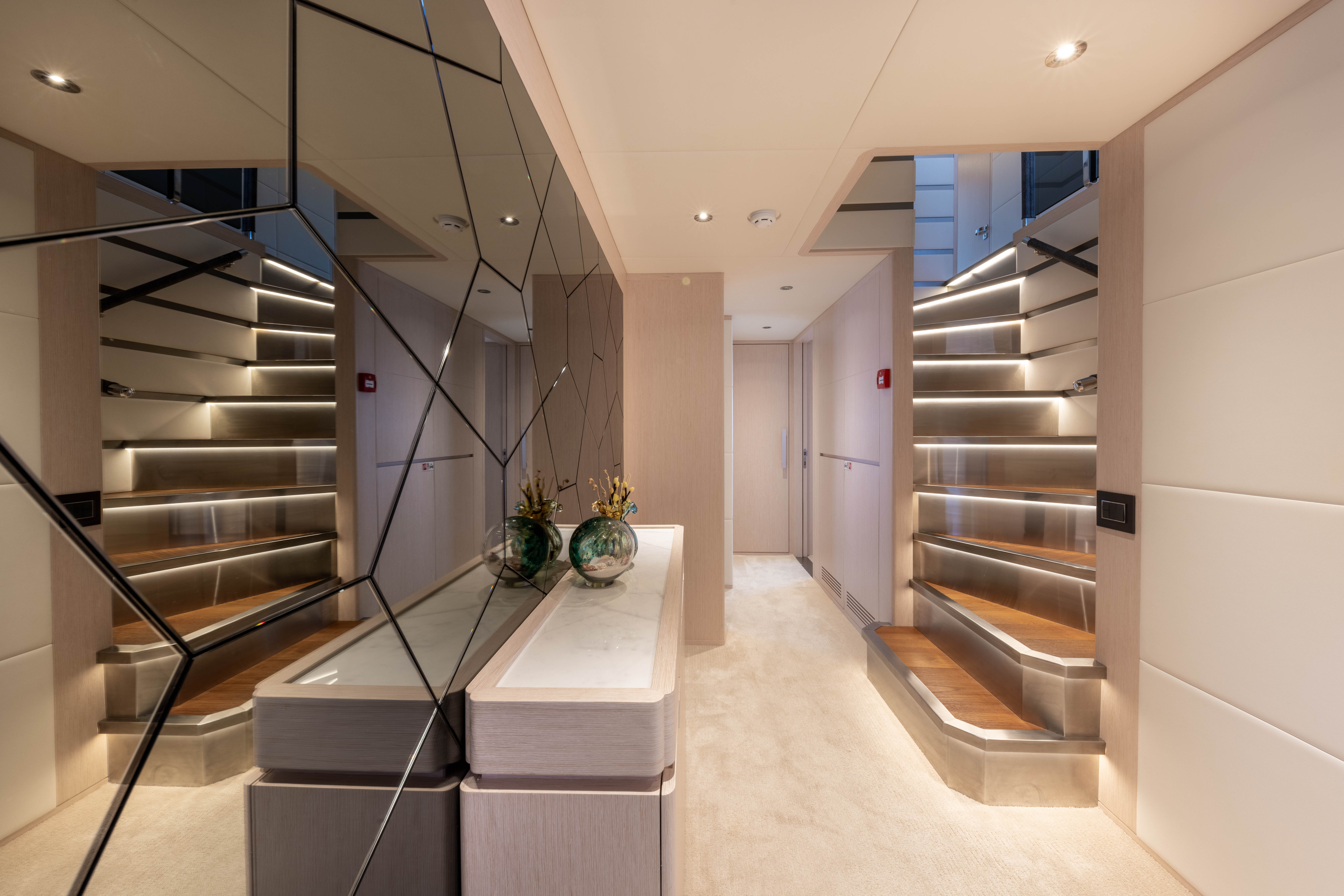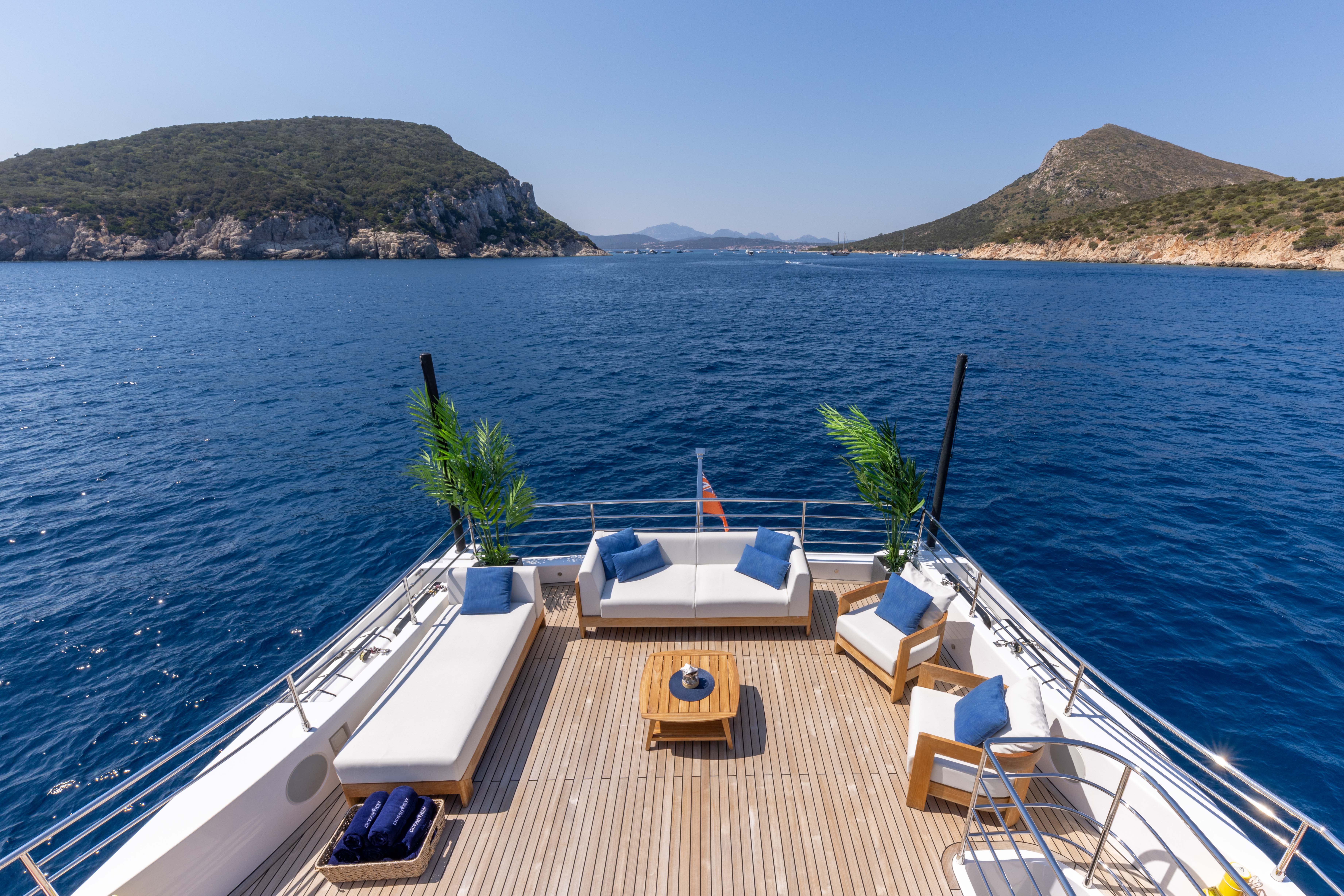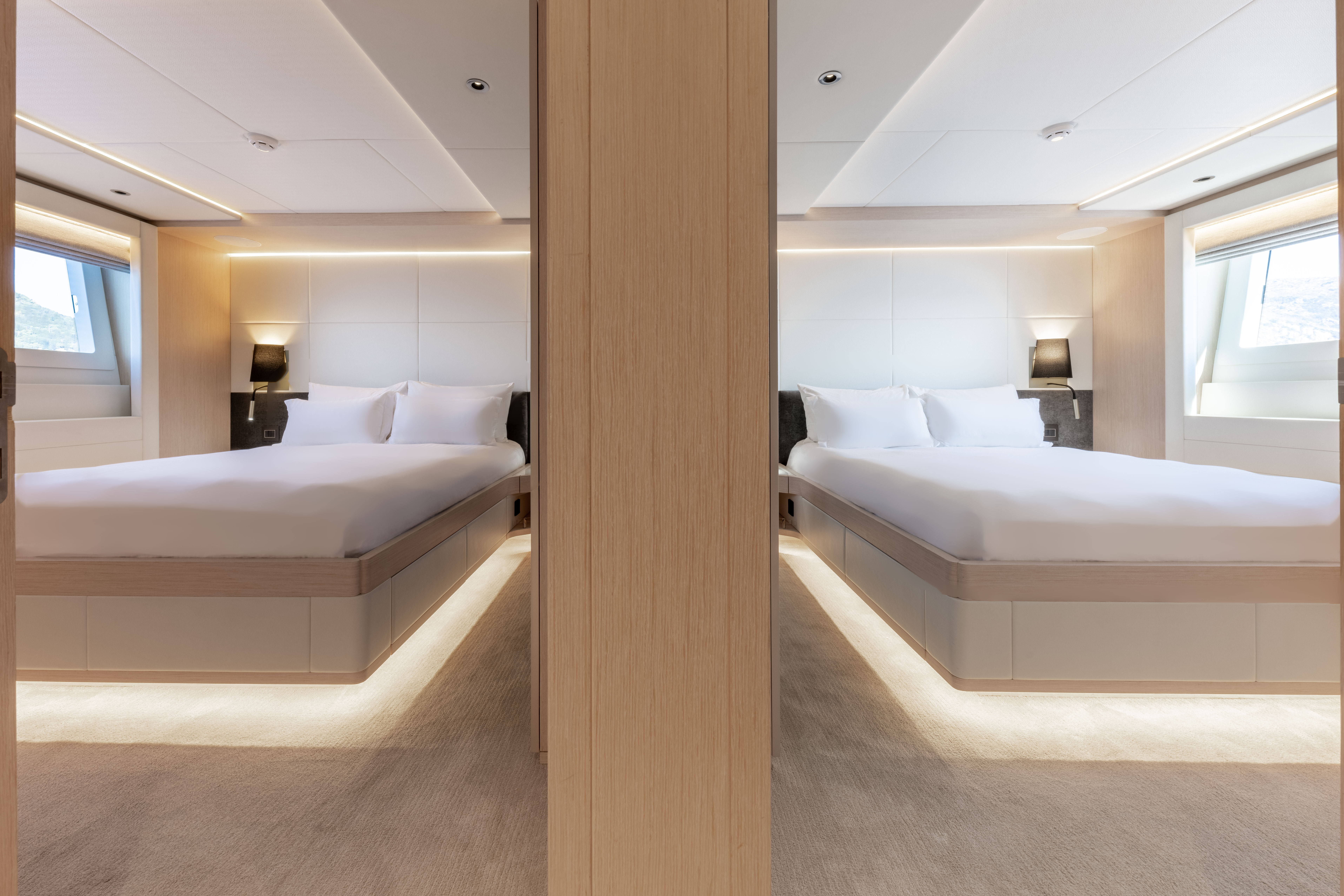 Le yacht dispose d’une cabine de maître sur le pont principal et peut accueillir jusqu’à 12 invités dans un confort absolu. Le sky lounge, équipé de balcons escamotables, offre un point de vue panoramique exceptionnel pour profiter pleinement de la beauté de la mer et des côtes.